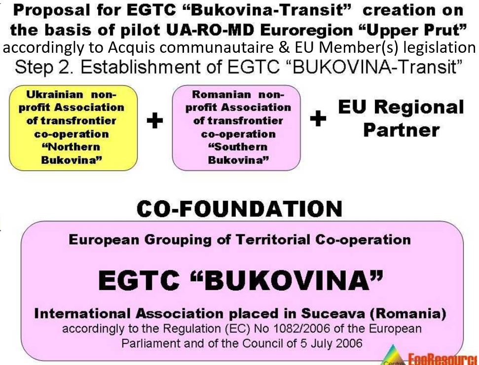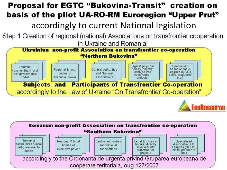 На остаточній стадії зазначені національні асоціації виступатимуть фундаторами міжнародних асоціацій (власне EGTC), що функціонуватимуть в країнах ЄС (у нашому випадку українського і румунського фундаторів – при Сучавській повітовій раді), діючи на основі Acquis Communautaire та законодавства країни-члена ЄС. До функцій утвореної у такий спосіб міжнародної асоціації – EGTC «Bukovina – Transit» належатимуть, серед іншого, остаточний відбір за принципом консенсусу і подання до ЄС спільних проєктів та отримання фінансування від програм ЄС. Трансфер коштів від ЄС до виконавців також відбуватимет через національні асоціації відповідно до ухвалених бюджетів конкретних проєктів. |