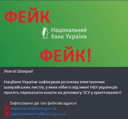 https://www.pravda.com.ua/news/2022/03/16/7331861/ Та придивімося уважно до самих формулювань: чи говорить Президент Зеленський «любі українці»? Чи відповідають запропоновані формулювання його мовному стилю? І, що найважливіше: чи поширювалася б така важлива інформація просто рухомим рядком? Хіба не мала б вона спершу бути офіційно оприлюднена? Тож тут правило одне: довіряємо офіційним джерелам інформації – офіційним сайтам Офісу Президента та інших урядових структур насамперед! Та ворогові мало просто дискредитувати українську владу. Необхідно ще й доповнити це фінансовими махінаціями, в результаті чого громадянин зазнає як психологічного стресу, так і фінансових втрат. Цього тижня було зафіксовано як мінімум дві спроби вторгнення РФ у приватно-фінансове життя українських громадян: 1. Нібито прохання від імені Національного банку України переказати кошти на допомогу ЗС України в криптовалюті. Пам’ятаймо: Національний банк не розсилає електронні листи громадянам». Не збирає кошти на допомогу у криптовалюті.