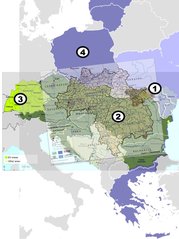 Рис. 4. Просування ідеї вертикального коридору на міжрегіональному і макрорегіональному рівнях у: пілотному Єврорегіоні «Верхній Прут» (1), Карпатській конвенції (2), та у країнах EUSDR (3) і 3SI (4). |