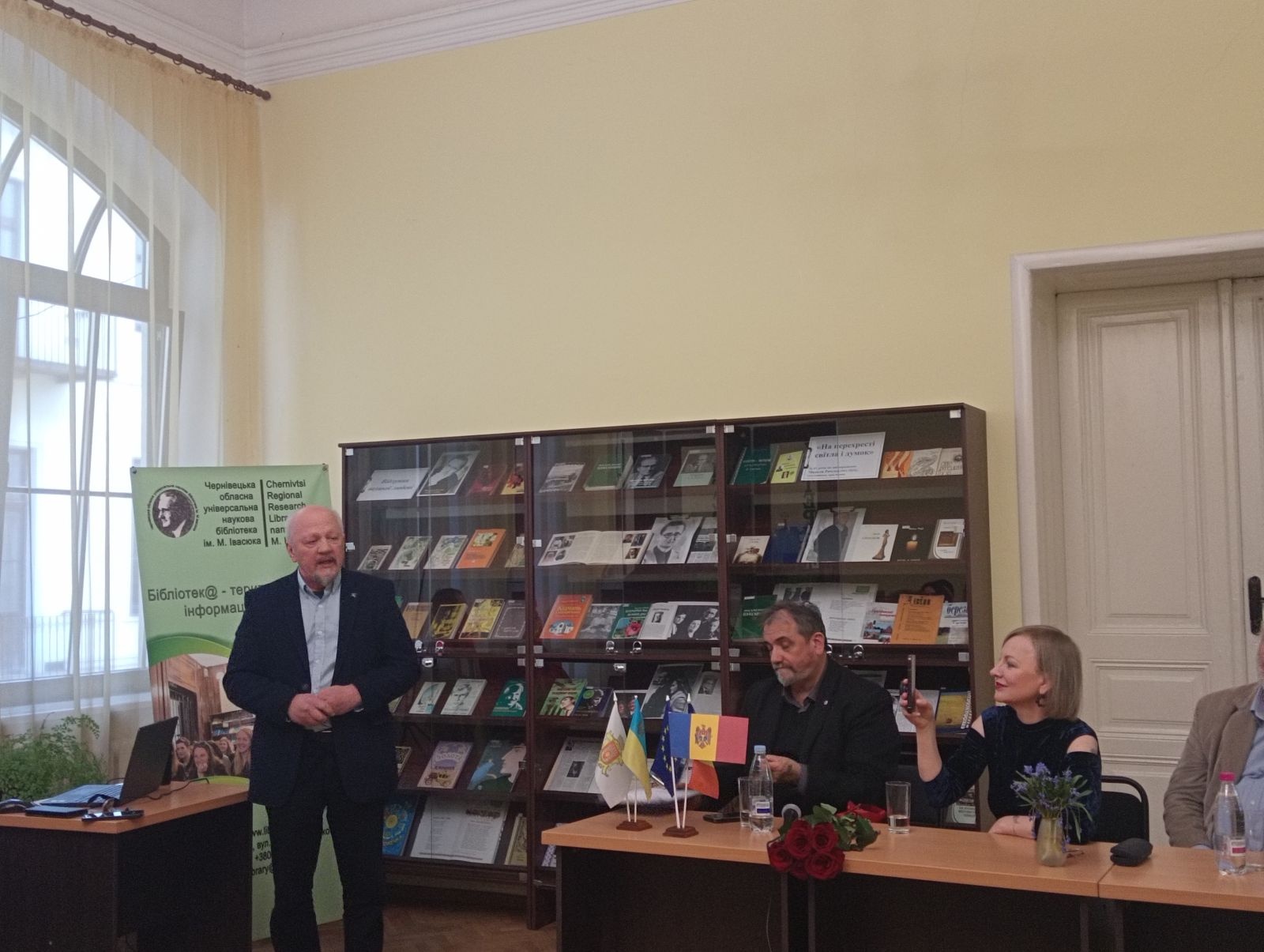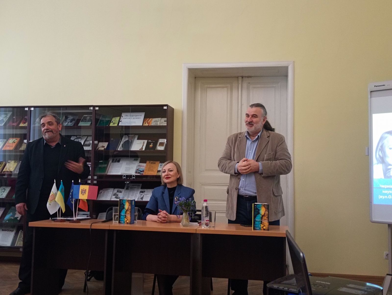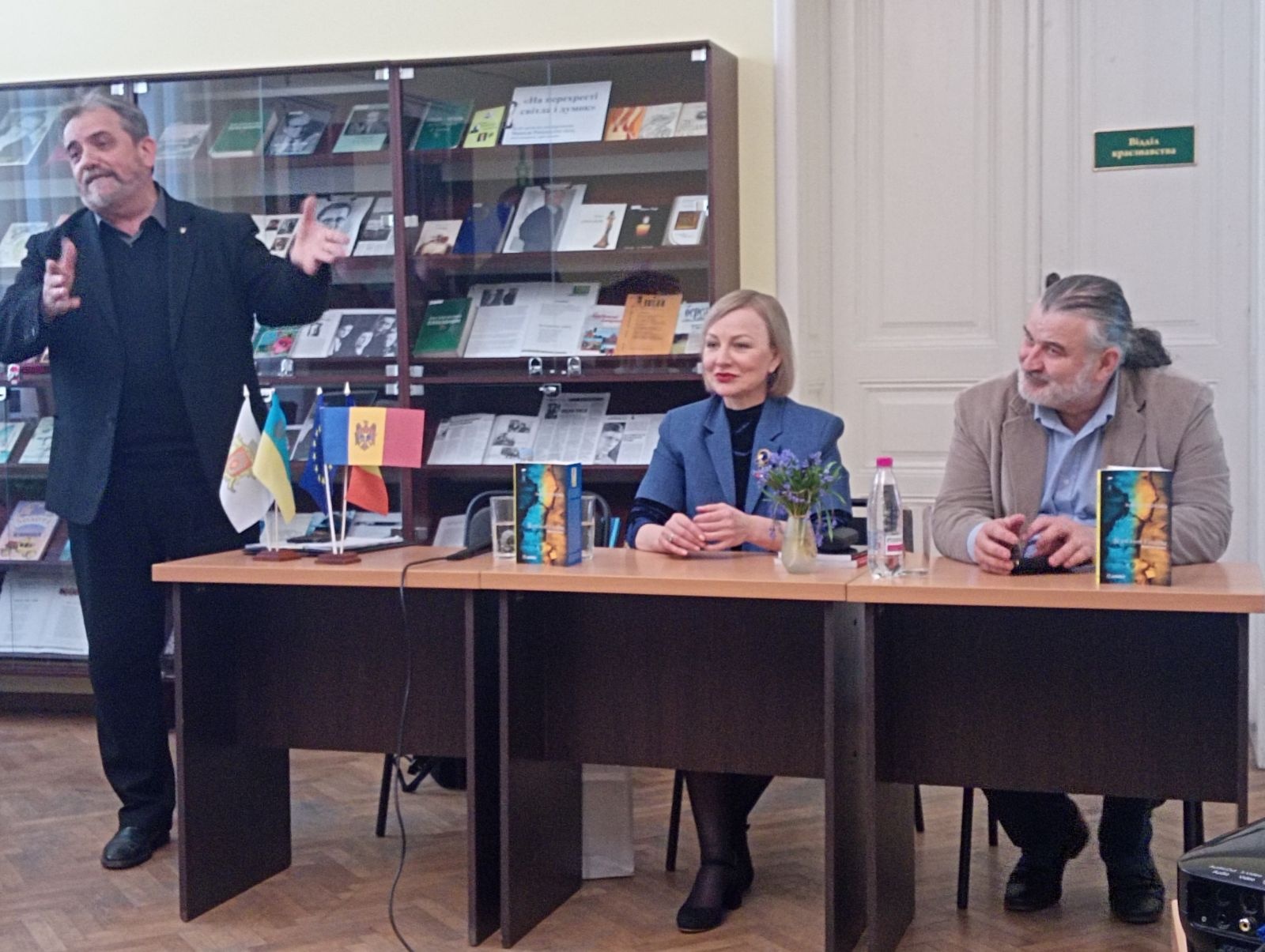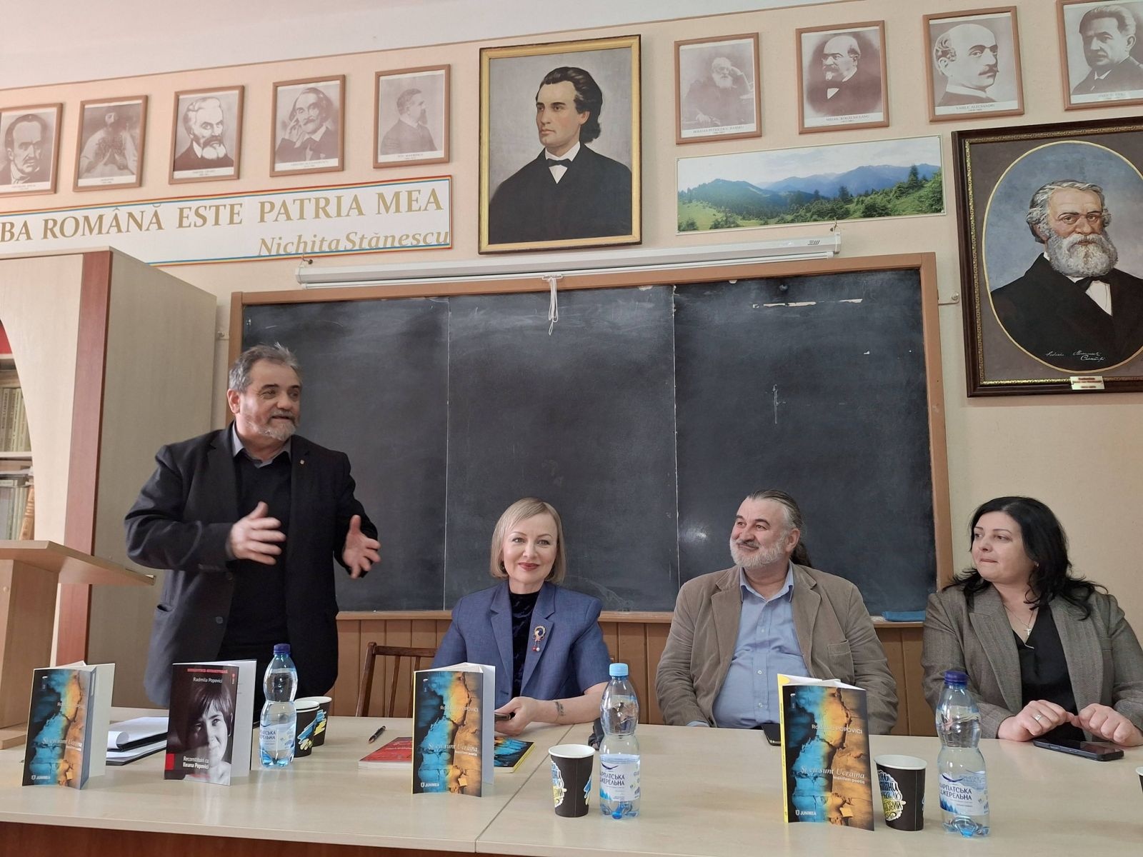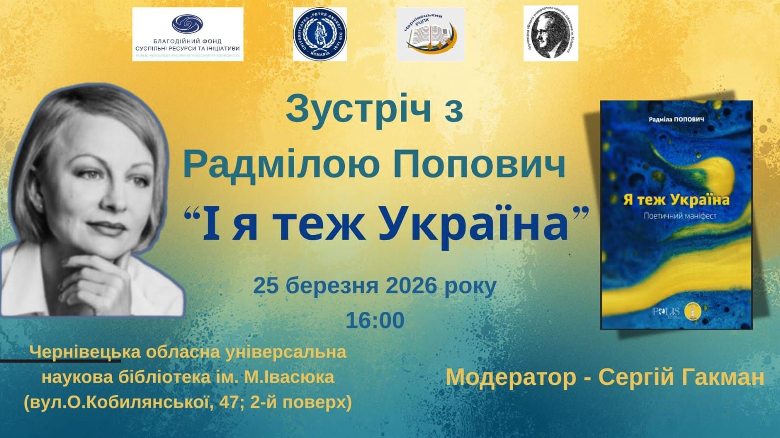 Радміла Попович – відома поетеса, авторка текстів популярних в Республіці Молдова та Румунії пісень. Народилася 31 серпня 1972 року в селі Флоріцоя Веке, Республіка Молдова. Закінчила філологічний факультет Державного університету в Кишиневі, є членкинею Спілки письменників Республіки Молдови та Румунії. Збірки Радміли Попович перекладені французькою, італійською, німецькою, іспанською, англійською, а віднедавна – і українською мовою. Книга «Я теж Україна» є емоційною та глибокою реакцією на російську війну проти України і водночас потужним жестом міжнародної солідарності з українським народом. Вперше збірка під назвою «Și eu sunt Ucraina» була видана у 2023 році румунською мовою у видавництві Junimea (м. Ясси, Румунія). У 2025 році побачило світ електронне видання українською мовою у видавництві Polis за сприяння професора, ректора Університету «Пєтрє Андрєй» Соріна Боканчі. Переклад збірки українською мовою здійснив Міхай Трайсте – письменник, журналіст, голова Бухарестської філії Союзу українців Румунії. 25 березня відбулося дві презентації: на кафедрі румунської та класичної філології філологічного факультету Чернівецького національного університету ім. Юрія Федьковича, під час якої Радміла Попович та Сорін Боканчя поспілкувалася зі студентами та викладачами закладу, а також у Чернівецькій обласній універсальній науковій бібліотеці ім. Михайла Івасюка. 26 березня творчу зустріч із письменницею провели на факультеті історії, політології та міжнародних відносин ЧНУ ім. Юрія Федьковича. Заходи модерував Сергій Гакман – кандидат історичних наук, доцент, заступник директора Чернівецького регіонального центру підвищення кваліфікації. Як зазначила авторка, поезії, вміщені у збірці, дуже відрізняються від того, що вона писала раніше: «Коли почалася війна, з’явилося розуміння, що потрібно якось протистояти цьому злу, і я вирішила, що моє слово має стати зброєю проти пропаганди і матеріалом для загоєння ран». В цій книзі, за словами Радміли Попович – біль, плач, розпач і прокляття. Водночас тут – вдячність українцям, які зараз на першій лінії, і захищають не тільки себе, а й всю Європу загалом. Авторка додала, що вона дуже хоче, аби ці поезії дійшли саме до військових, які в окопах, щоб вони бачили цю підтримку і знали, що все, що вони роблять – недаремно. Імпульс до видання збірки дав ректор Ясського Університету «Пєтрє Андрєй» Сорін Боканчя. Поезію Радміли Поповіч він побачив у фейсбуці, після чого звернувся до поетеси із пропозицією допомогти видати збірку. Серед різних варіантів зупинилися саме на назві «Я теж – Україна», яка свідчить про солідарність з українським народом. «Війна в Україні – це не лише війна українців. Це війна всіх для того, щоб зберегти гуманність. І хоча ми більше слідкуємо за тим, що роблять військові, – війна стосується всієї громади, всього суспільства». Військовим, які на фронті, наголосив Сорін Боканчя, потрібна не лише зброя і їжа – вони мають знати, що про них думають, що їх цінують і підтримують. І саме такі книги можуть стати для них моральною підтримкою. «Це важка література. Але це література, яка не залишить байдужим», – підсумував він. Книга в перекладі українською є у вільному доступі. Захід організовано спільними зусиллями Чернівецької обласної універсальної наукової бібліотеки ім. Михайла Івасюка, У