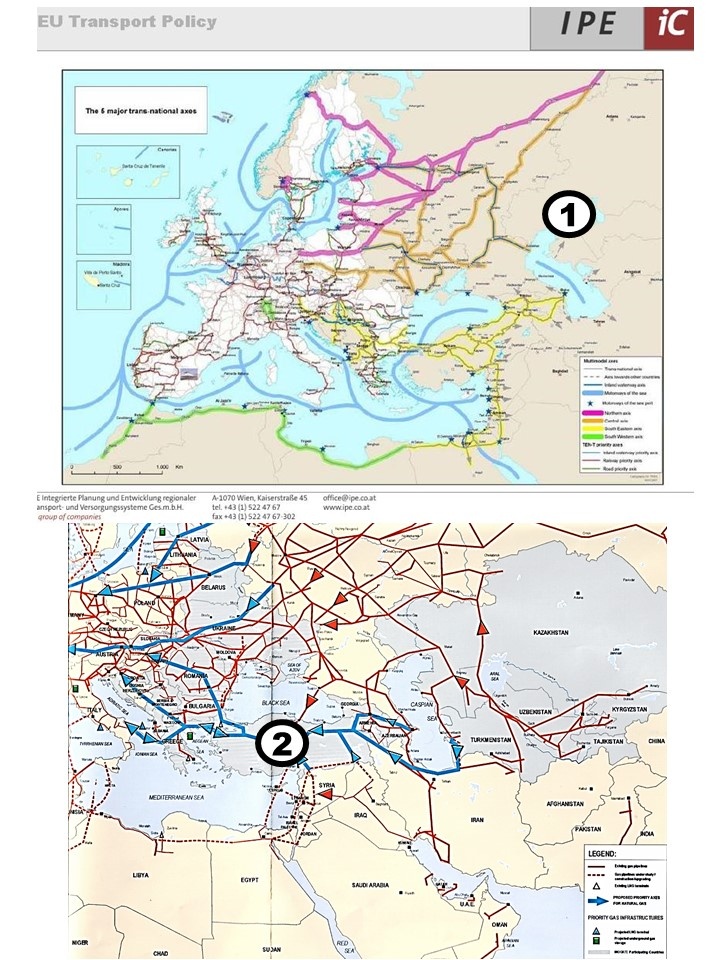 Рис. 1 Вертикальний транспортно-енергетичний коридор: а) пострадянські транспортні -1 та газові – 2 «щупальці» СРСР/РФ до країн Європи; б) основні гілки TEN-T ВВА: 1 – через Україну, оминаючи Карпати, 2 – в обхід України, двічі перетинаючи Карпати; в) газовий коридор комунікацій до Карпатських сховищ: 1– через Ісакчу–Орлівку і Молдову; 2 – в обхід України через Угорщину, Австрію, Словаччину; 3 – найкоротший через Румунію та північну частину газогону «Ананьїв – Богородчани»; г) можливості добового депонування електроенергії з Центрально-Східної Європи на Дністровському гідроенерегоакумулюючому комплексі. |