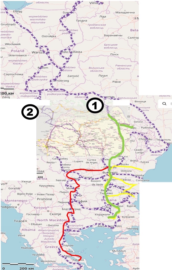 Як видно з Рис. 3-а), Балтійсько-Чорноморські торгово-транспортні сполучення «з варяг у греки» в історичному українському просторі від Карпат до Дніпра відігравали значну роль у розвитку як Київсько-Галицької Руси до ординської навали так і, зокрема, для Молдови після неї (Рис. 3-б). Але тривале нехтування можливостями Угоди AGTC-UNECE-1991, яка передбачала відновлення сполучень цим коридором, розбудованим за результатами Кримської війни у ХІХ ст. вздовж нинішнього східного флангу ЄС і НАТО з аналогічними цілями територіального розвитку і військової мобільності (Рис.3-в), стимулювало Угорщину і Словаччину до блокування євроінтеграційного поступу України. Між тим, ідея вертикального коридору (Рис 4), що була закладена у експериментальний Єврорегіон «Верхній Прут» ще у 1990 рр. (1), та, надалі, до підвалин реалізації Карпатської конвенції (2), і, у свою чергу, далі просувалась через Стратегію ЄС для Дунайського регіону (EUSDR) (3) для остаточного втілення у Ініціативі Тримор’я (3SI) (4). Водночас, у сфері інформаційно-комунікаційно- технологічного забезпечення та цифровізації проєктів у цих та ряді суміжних секторів, з українського боку пропонувалось комплексне застосування гео-інформаційних технологій (ГІС) для транскордонного просторового і безпекового планування з обміном гео-просторовою інформацією між розподіленими базами даних. Однак у процесі повернення уряду Орбана в 2010 році та його співпраці з рф, користаючи рішення сумнозвісного Бухарестського саміту НАТО у 2008 році, угорська сторона ініціювала подальшу розробку цього напряму проєктної взаємодії лише країнами розширеного Вишеграду V4+2 з Румунією і Болгарією, відокремивши Україну і Молдову. |