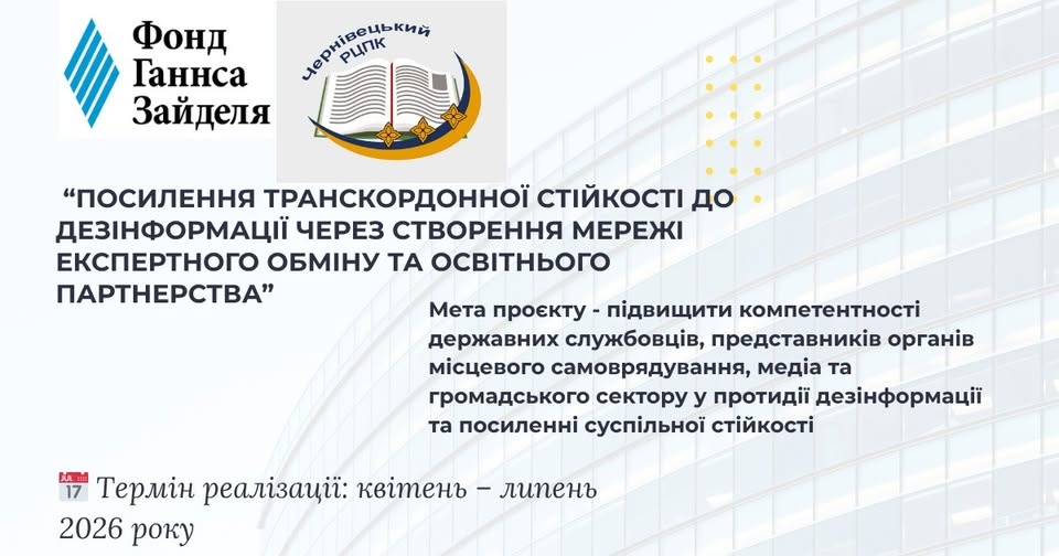 За підтримки Фонду Ганнса Зайделя в Україні Чернівецький регіональний центр підвищення кваліфікації розпочав реалізацію проєкту «Посилення транскордонної стійкості до дезінформації через створення мережі експертного обміну та освітнього партнерства».